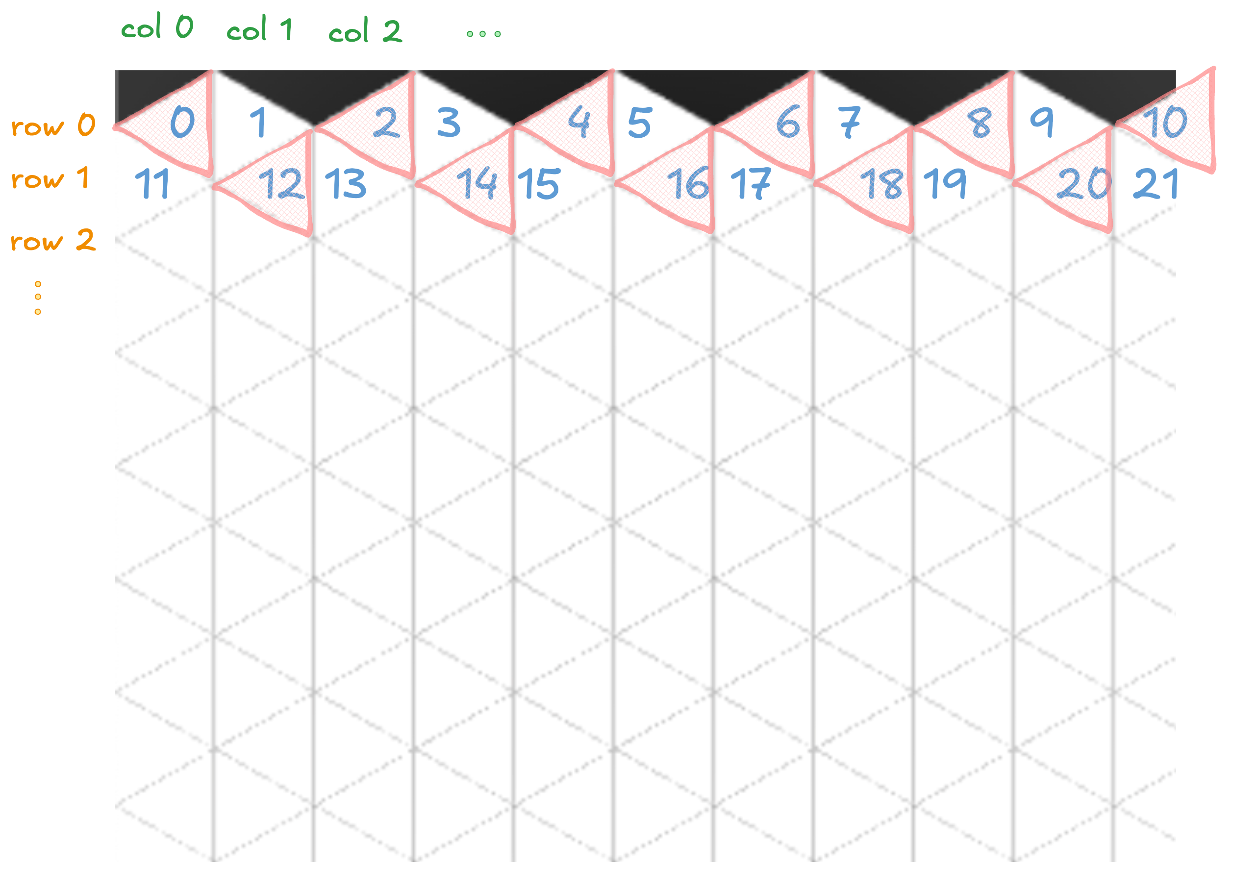 The triangles are tricky to imagine as a grid so here is a diagram to help understand