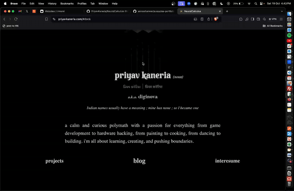 Navigation in this portfolio is where traditional meets innovative. The dock provides quick access to main sections, but the real magic happens behind the scenes.